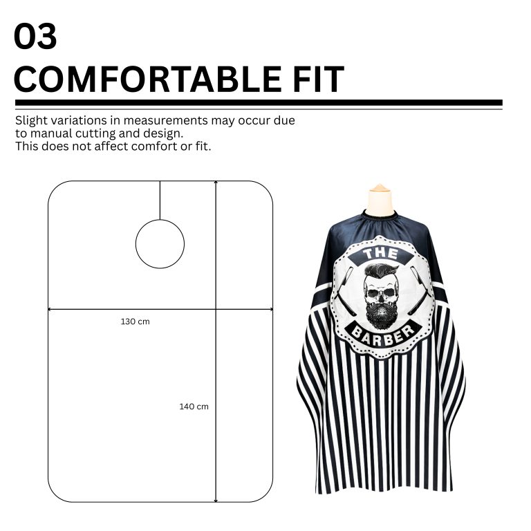 De mantel sluit goed aan rond de nek zonder te knellen en voorkomt dat losse haren, water of haarproducten onder de stof terechtkomen. Hierdoor blijft de drager comfortabel, ook bij langere behandelingen. Het ruime model maakt de kappermantel geschikt voor zowel volwassenen als tieners.