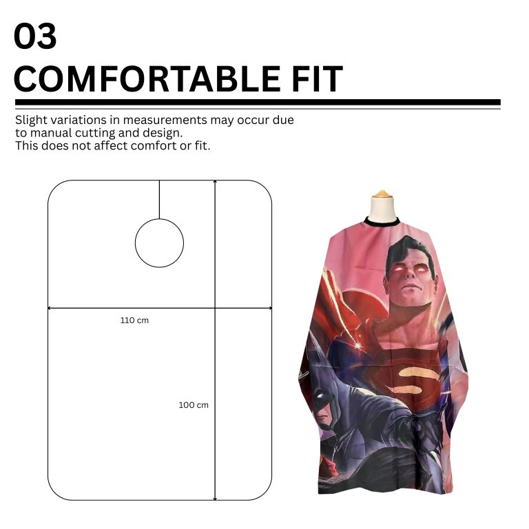 De mantel sluit goed aan rond de nek zonder te knellen en voorkomt dat losse haren, water of haarproducten onder de stof terechtkomen. Hierdoor blijft de drager comfortabel, ook bij langere behandelingen. Het ruime model maakt de kappermantel geschikt voor zowel volwassenen als tieners.