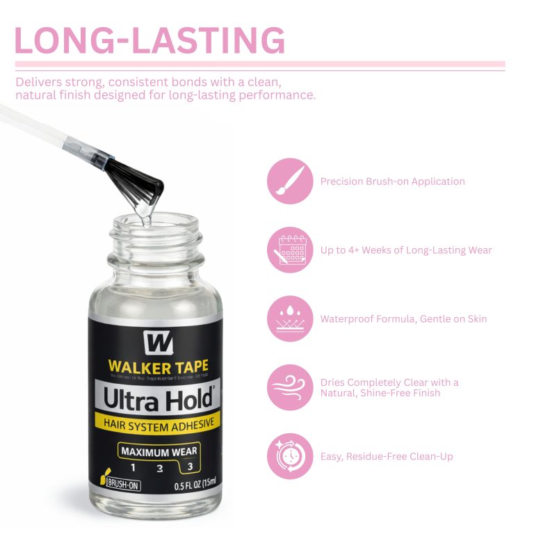 • Snel schoon te maken: Ultra Hold is een van de langst houdende lijmen voor haarsystemen op de markt, met een betrouwbare hechting die 4 weken of langer kan meegaan.